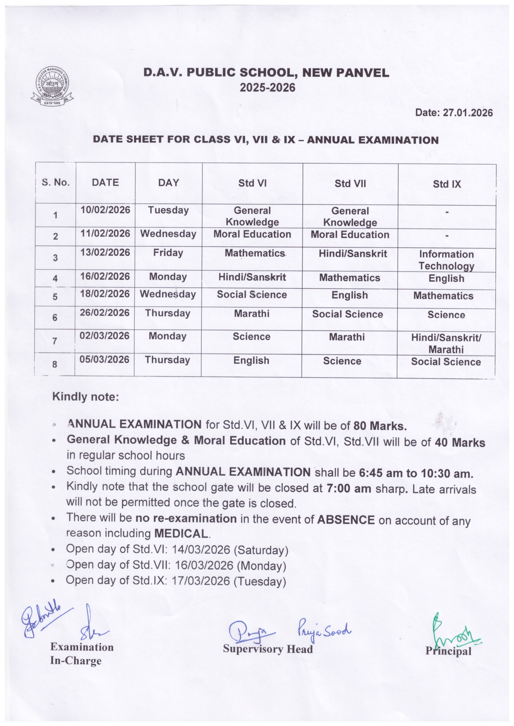 Date Sheet for Std VI, VII & IX Annual Exam