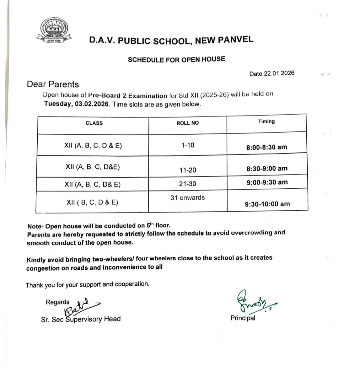 Open House Schedule For Class XII Pre Board- II Exam