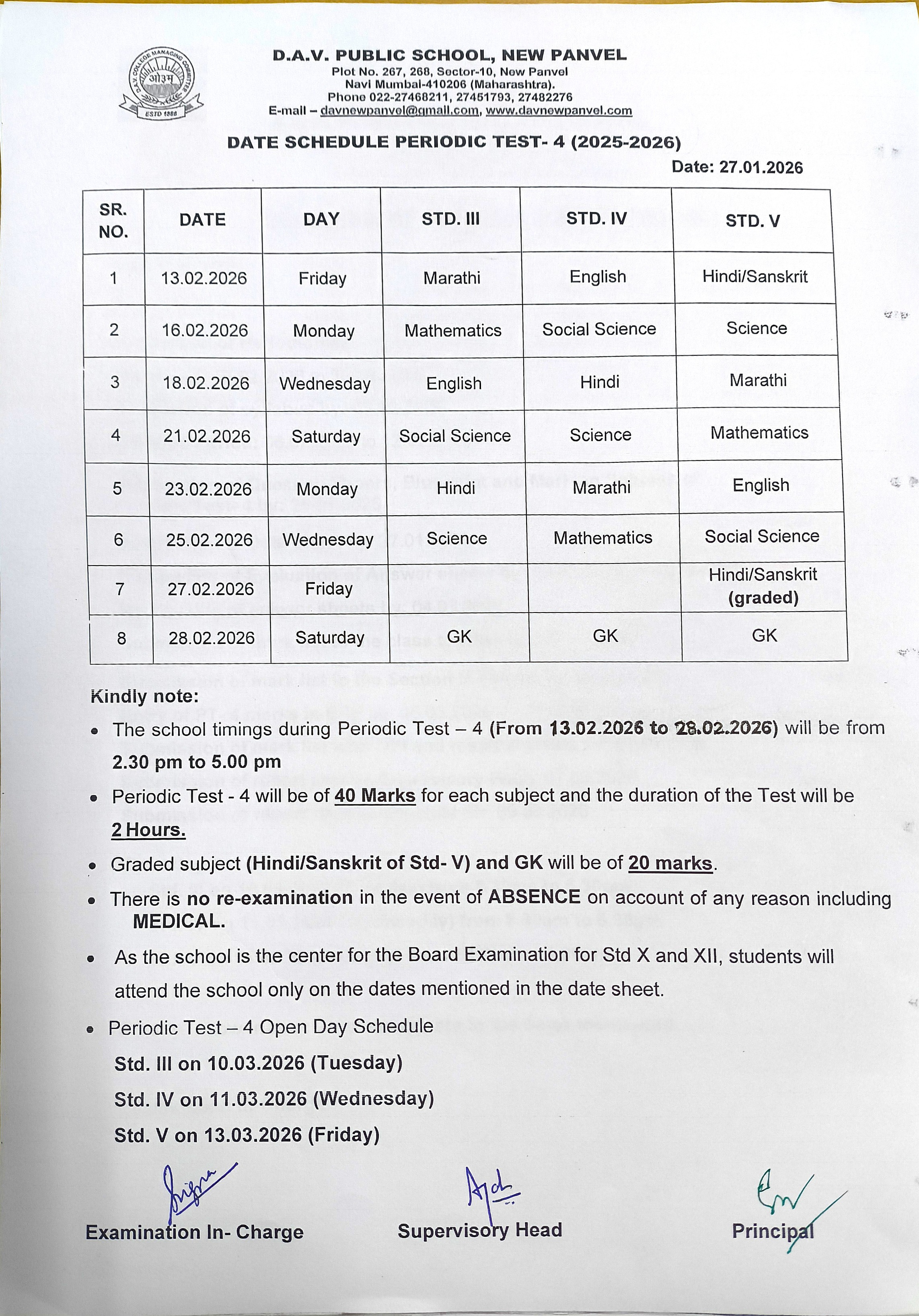 Date Schedule for Std III to V Periodic Test -4 (2025-26)
